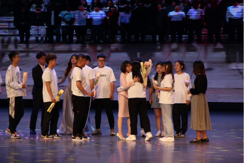 2019级毕业生代表惊喜登台为赵老师献上鲜花和拥抱,全场毕业生自发起立感谢老师四年来的付出与关爱,场面热烈温馨,师生纷纷感动落泪。