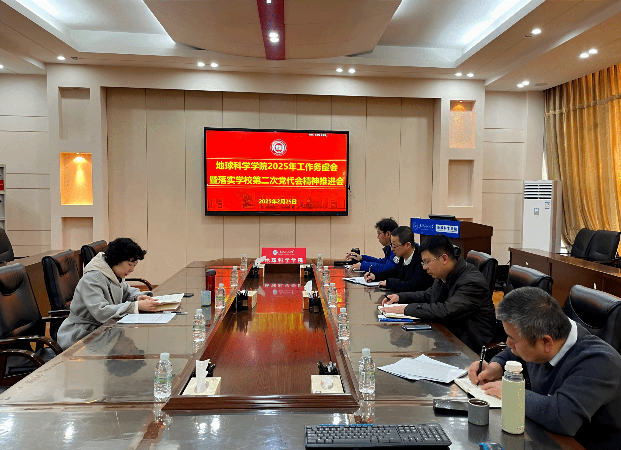 2月25日,地球科学学院2025年工作务虚会暨落实学校第二次党代会精神推进会在514会议室举行。学院领导班子全体成员参加会议,围绕学院发展的关键议题展开深入研讨,为新一年的工作谋篇布局。会议由党委书记韦丹宁主持。