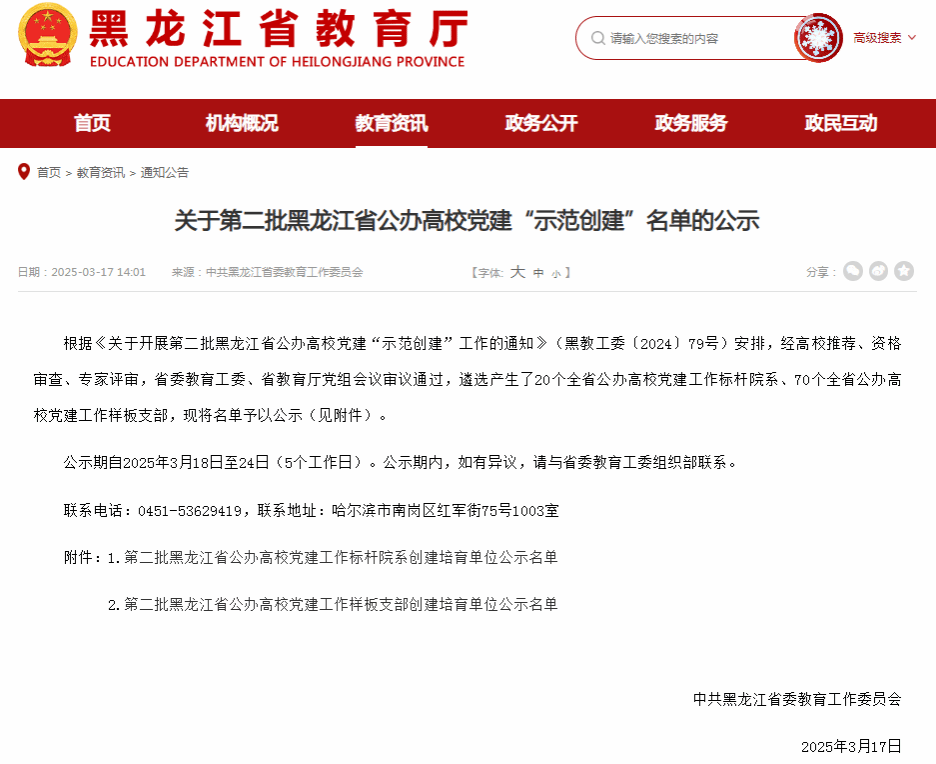 近日,黑龙江省委教育工委公示了第二批黑龙江省公办高校党建“示范创建”名单,球盟会党委获批全省公办高校党建工作“标杆院系”创建培育单位。
