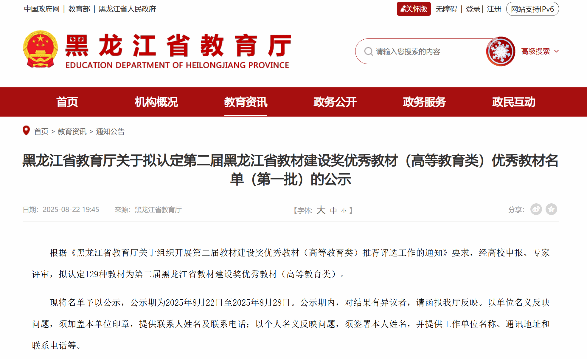 近日,黑龙江省教育厅发布了《关于拟认定第二届黑龙江省教材建设奖优秀教材(高等教育类)名单(第一批)的公示》,经各高校申报、专家严格评审,全省共评选出30部获奖研究生优秀教材(其中特等奖3部、一等奖10部、二等奖17部),球盟会有1部教材荣获省级研究生优秀教材一等奖。