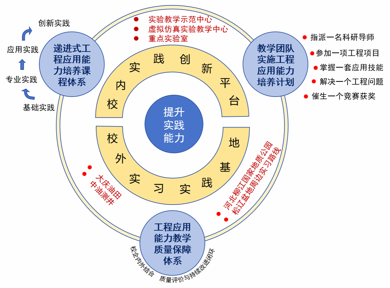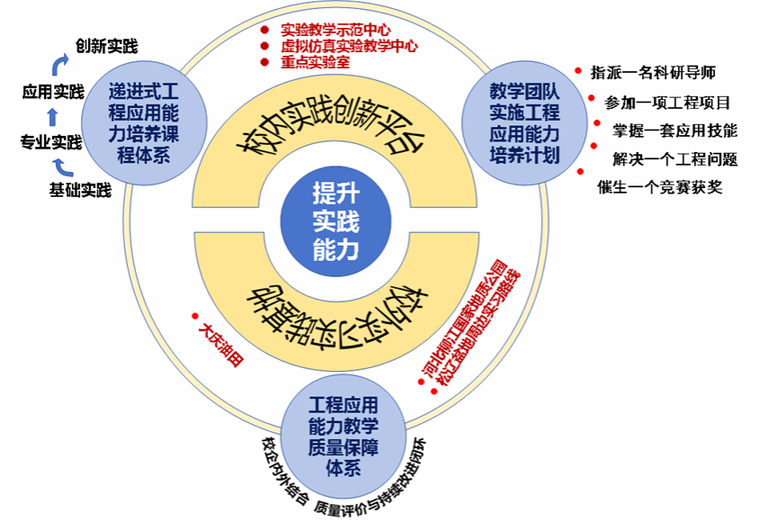校内统筹实验教学示范中心、虚拟仿真实验教学中心、重点实验室,打造油气全景实践创新平台。校外依托大庆油田、河北柳江国家地质公园等,建设建设26个人才培养实习实训基地。采用“基础实践、专业实践、应用实践、创新实践”递进式工程应用能力培养课程体系,逐级夯实学生实践能力;教师团队实施“五个一计划”,即每位学生指派一名科研导师,参加一项工程项目,掌握一套应用技能,解决一个工程问题,催生一个竞赛获奖,提升学生个性化应用能力;校企内外结合,对毕业生开展多途径质量评价,形成与教学持续改进闭环的保障体系。