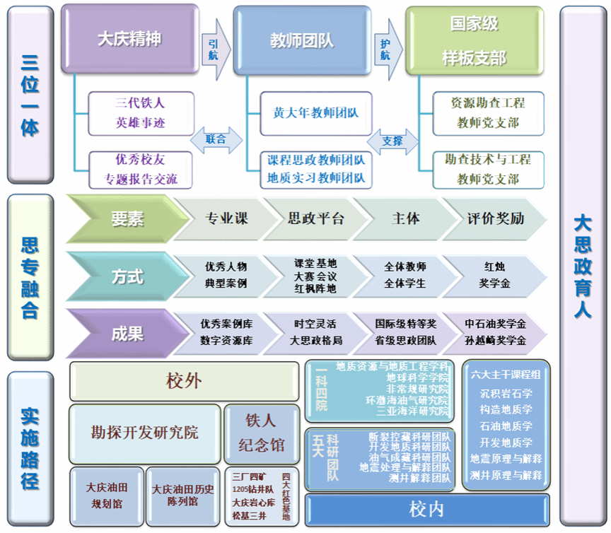 (2)大庆精神引航,教师团队护航,样板支部支撑,构建“三位一体、思专融合”的大思政育人模式