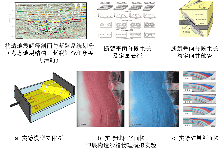研发了八项“核心技术”:(1)复杂裂陷盆地精细3D或2D地震解释技术;(2)构造建模及构造平衡剖面编制技术;(3)断裂平面和垂向生长机制及定量识别技术;(4)断裂启动和再活动模式及定量分析技术;(5)断裂系统划分及油(气)源断层厘定技术;(6)考虑几何学、运动学和动力学的相似实验模型构建技术;(7)构造变形的应变定量分析技术;(8)构造演化动态过程数值模拟表征技术。