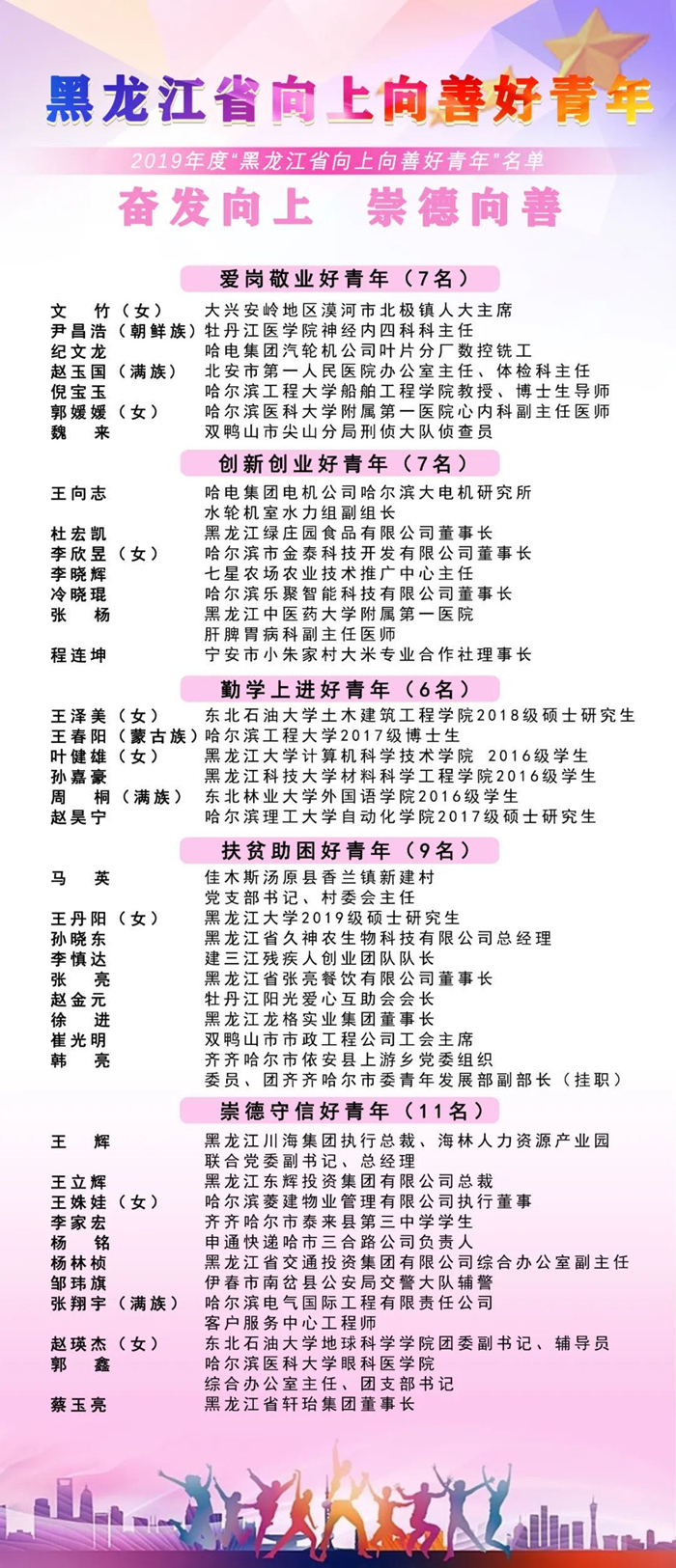 2019年度“黑龙江省向上向善好青年”共分为爱岗敬业好青年、创新创业好青年、勤学上进好青年、扶贫助困好青年、崇德守信好青年五类荣誉,共40名优秀青年获此荣誉,当选人员涵盖医务工作者、科技工作者、创业者、教师、产业工人、公安干警、志愿者、大中学生等职业和领域,具有广泛的代表性,其中包括在新冠肺炎疫情防控工作中涌现出的优秀青年典型。“争做新时代向上向善好青年”典型选树活动,团省委面向各行各业和基层一线,寻找推选一批带头践行社会主义核心价值观、积极传播正能量的身边好青年,带动广大青少年奋发向上、崇德向善,推动全社会形成践行社会主义核心价值观的良好风尚。