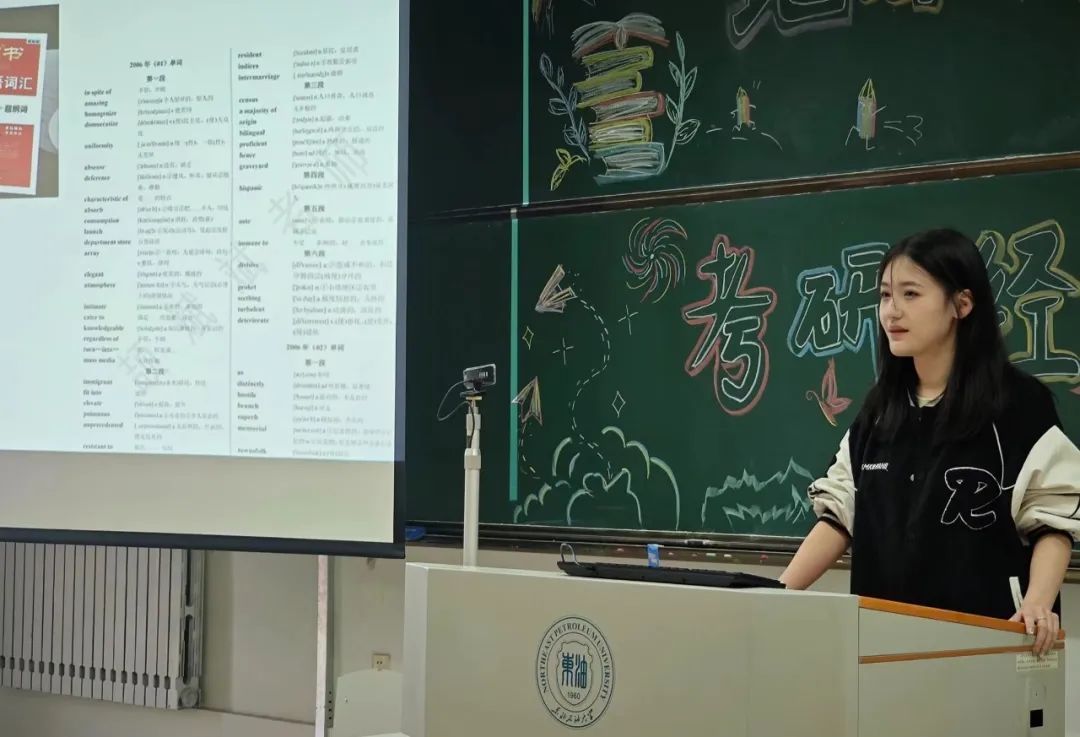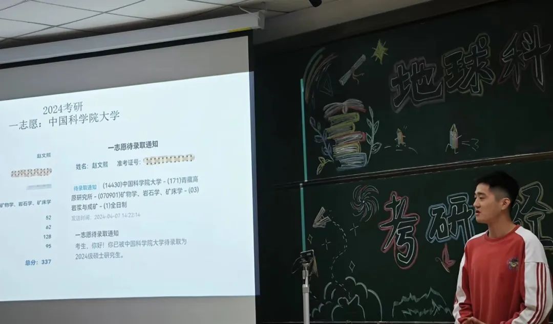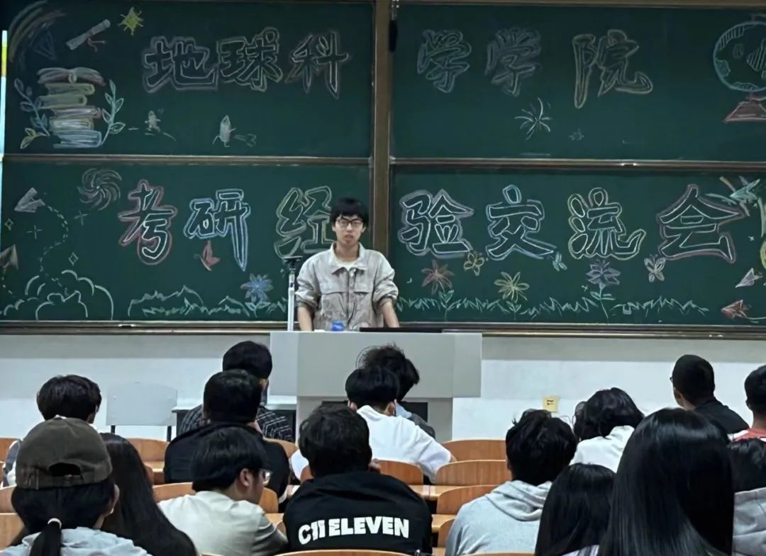 第三位进行分享的是刘维则同学,他以329分的成绩考入中国石油大学(北京)。刘维则主要就专业选择和备考规划提出了建议。首先,他对“选择学硕还是专硕”的问题进行了详细解答,具体阐述了两者的突出特点和不同。其次,他对球盟会学生考研专业选择进行了介绍,针对“勘探还是开发”的选择,他指出考研专业选择需要考虑专业适配度、对专业的兴趣度和未来工作计划等因素,要做到全方面考虑,理性决策。同时他针对专业课复习策略上提出了很多建议,并与同学们分享了优质的课程,供同学们学习。在分享的最后,刘维则学长向每一位学弟学妹寄语道:“功不唐捐,玉汝于成,希望每一位学弟学妹们都能成功上岸!”