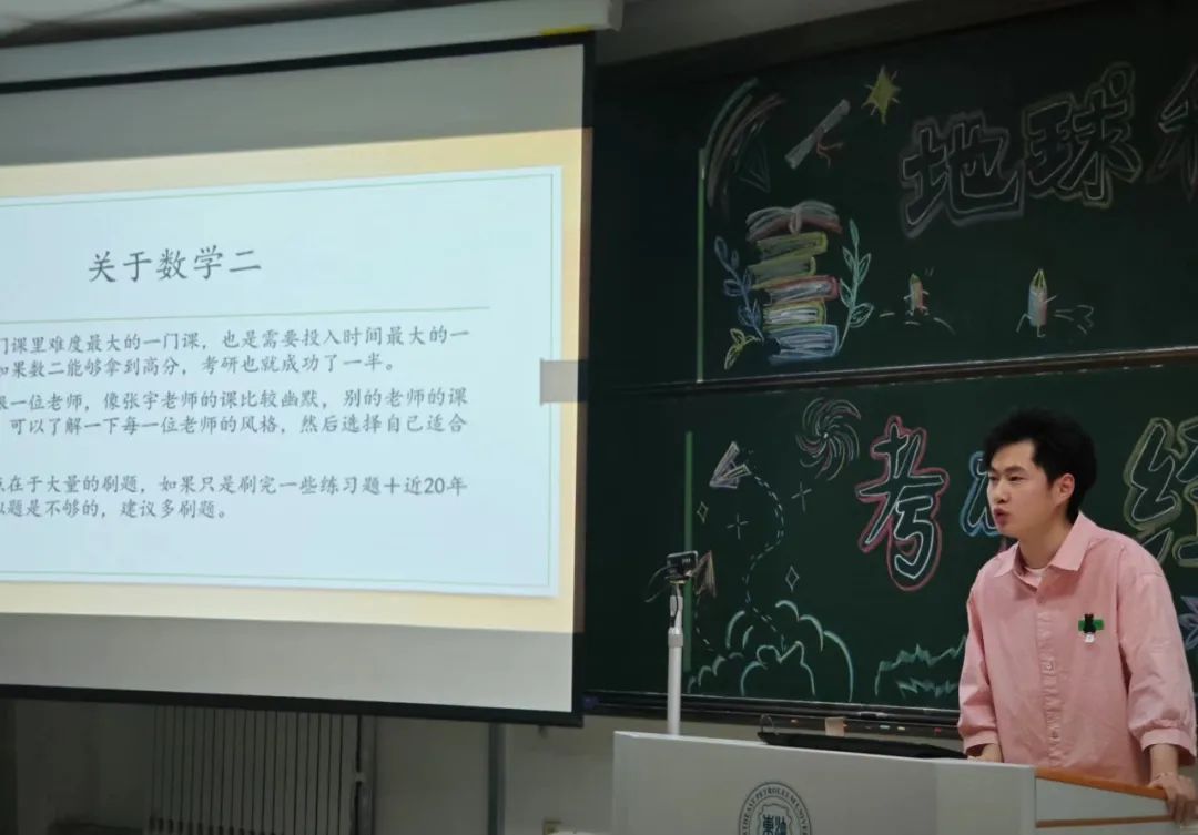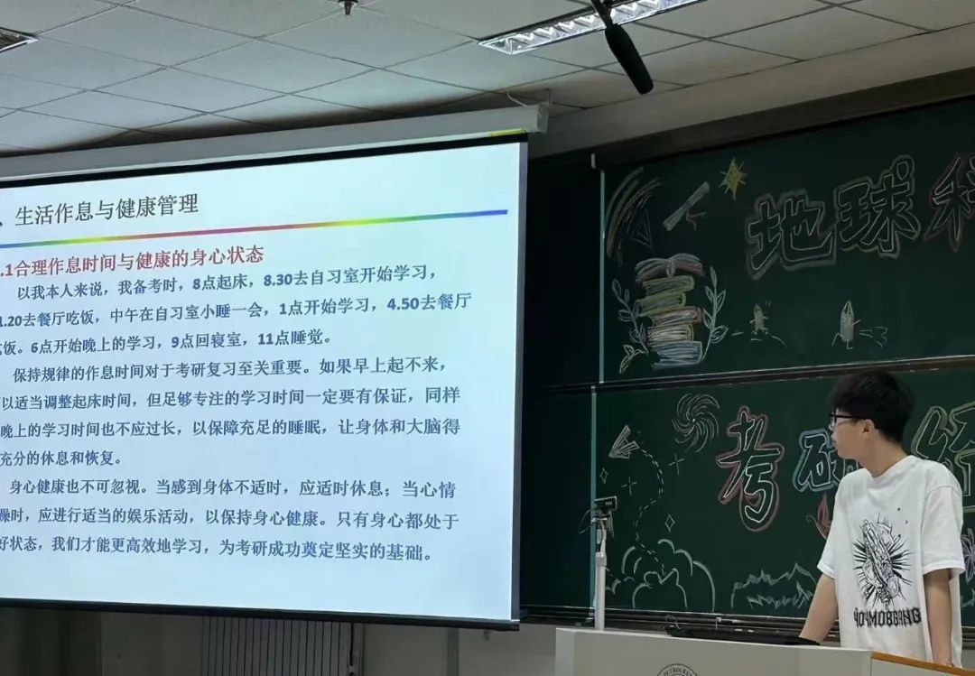 第二位为大家进行分享的是王祥同学,他以324分的成绩考入中国地质大学(武汉)。王祥分享了自己的考研故事并就心态提出建议。首先,我们要在备考前询问自己为何要考研,是否真正做好了心理准备。其次,我们要注意心态调整。考研面对的同辈压力和课业压力不可避免,我们要高效学习,更要避免情绪内耗,稳住心态。