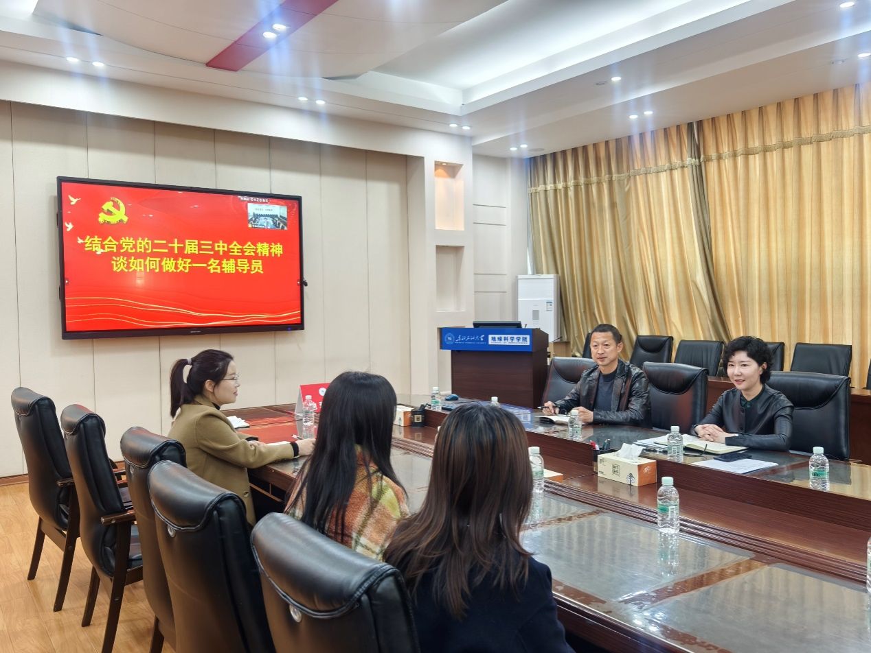 为了全面理解和深入贯彻学习党的二十届三中全会精神,促进辅导员队伍成为驱动教育改革发展的重要支柱,学院于10月17日下午,在地科馆514会议室召开了“结合党的二十届三中全会精神谈如何做好一名辅导员”专题培训大会。此次培训大会由学院党委书记韦丹宁主讲,党委副书记王钢、全体辅导员参加本次培训,会议采用线上和线下的方式进行。