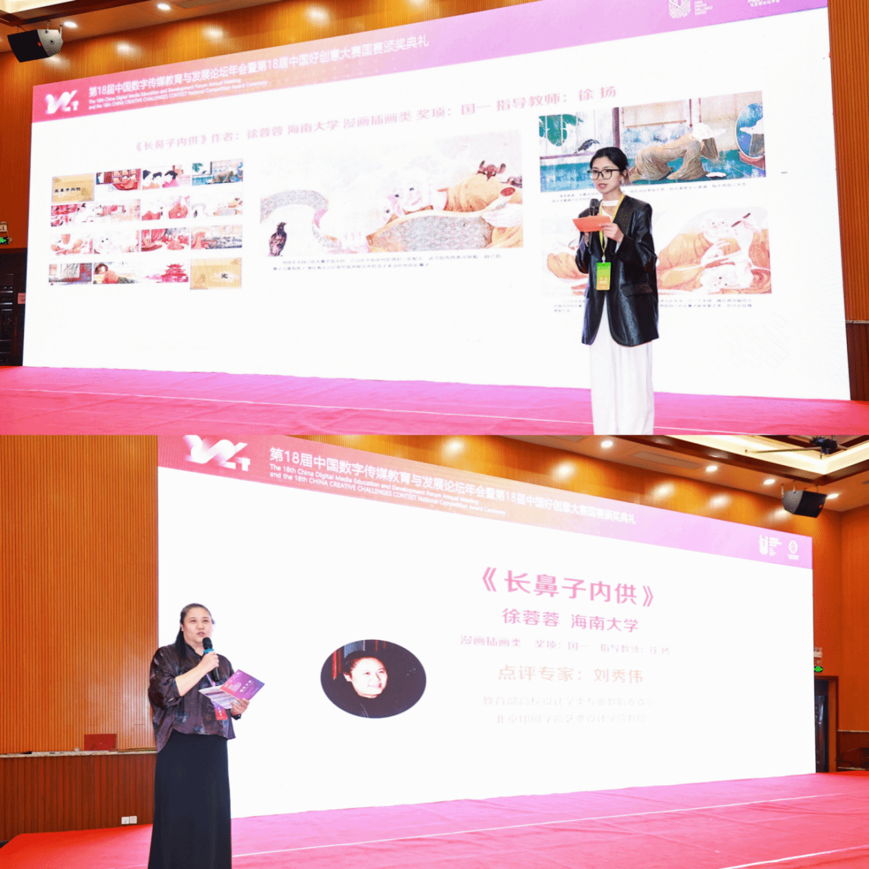 Beat365学生徐蓉蓉荣获国赛一等奖,并作为获奖嘉宾邀请上台进行作品创作分享。教育部高校设计学专业教指委委员、北京印刷学院艺术设计学院教授刘秀伟现场点评认为:这部插画作品在艺术风格、主题表达、技术手法、情感传达以及文化内涵等多个方面都表现出色,是一次成功的艺术创作实践。