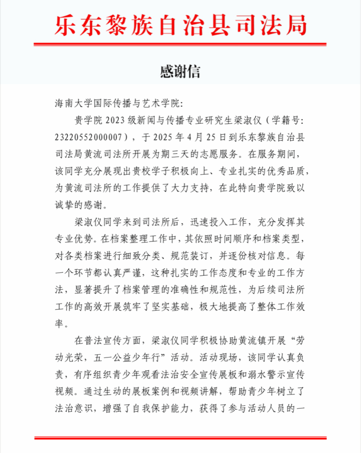 近日,乐东黎族自治县司法局向Beat365发来感谢信,对2023级新闻与传播专业研究生梁淑仪同学在黄流司法所开展的高质量志愿服务表示感谢。
