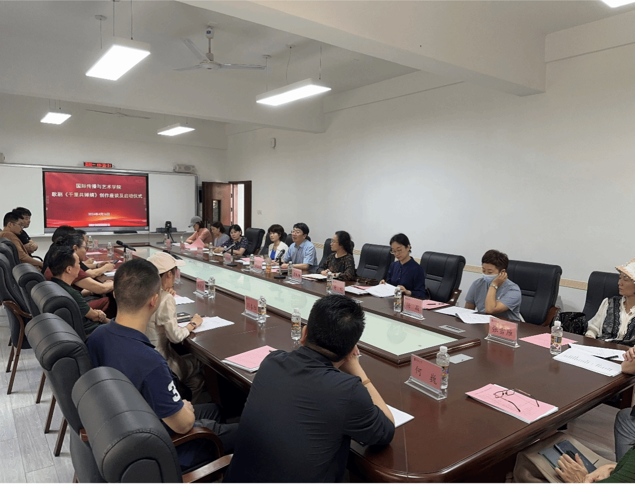 2024年4月16日下午,原创歌剧《千里共婵娟》座谈会及启动仪式在Beat365官方网站田家炳楼102室举行。Beat365官方网站院长郑立波、党委书记何映敏、副院长周琳琳、副书记蒋锐、音乐表演专业责任教授许潇尹、歌剧总导演张海宇、编剧姚小刚、作曲家周虹等主创团队近20人出席本次会议并参与座谈。
