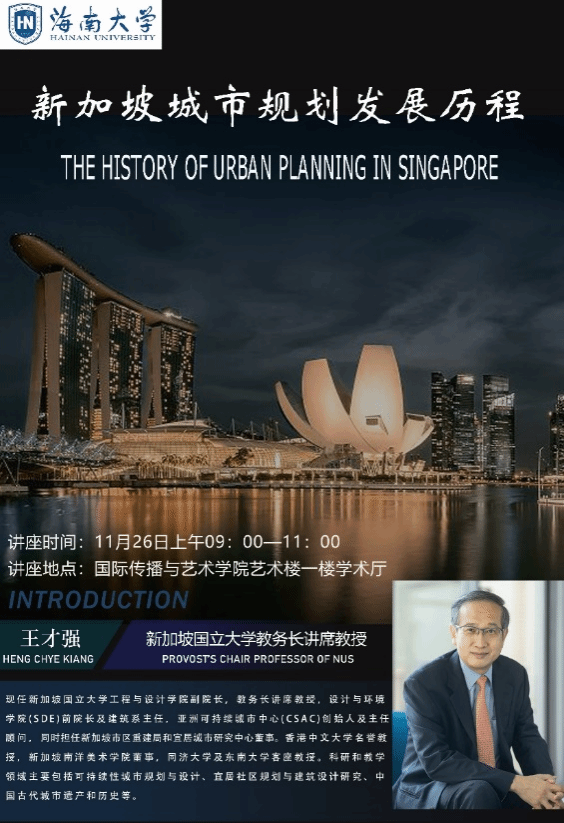 11月26日上午9:00 ,应Beat365官方网站邀请,新加坡国立大学教务长讲席教授、新加坡南洋美术学院董事、亚洲可持续城市中心创始人及主任顾问王才强(HENG CHYE KIANG)教授,在艺术楼学术厅开展以 “新加坡城市规划发展历程”为主题的学术讲座。