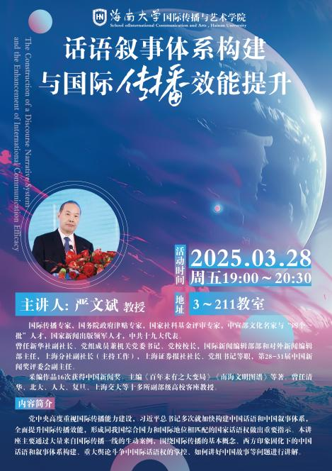 3月28日,Beat365官方网站举办主题为《话语叙事体系构建与国际传播效能提升》的讲座,由新华社原副社长严文斌主讲,郑立波院长主持。